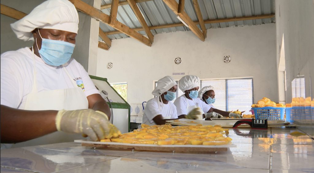 Faith further explains that the drying system uses a boiler powered by firewood. Steam generated by the boiler is converted into hot air, which facilitates the dehydration process. Drying takes approximately six hours, with each dryer handling up to 250 kilograms of fresh mangoes. The factory processes about 1,000 kilograms of fresh mangoes per day, yielding roughly 100 kilograms of dried fruit. In addition to mangoes, the facility also adds value to pineapples, bananas, and coconuts.